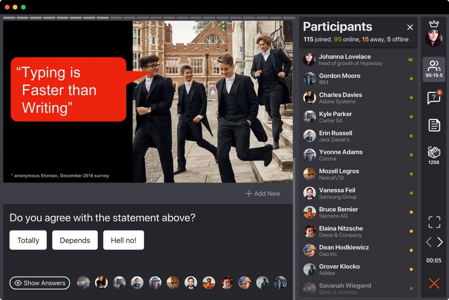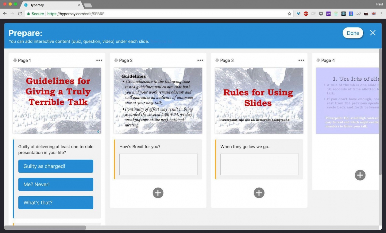Good presenters have great slides Great presenters know how to get their audience involved. Hypersay gives you an easy way add live polls, quizzes, open questions, interactive images and videos. Add interactions to your slides Once you’ve uploaded your slides, you are ready to start adding inter...